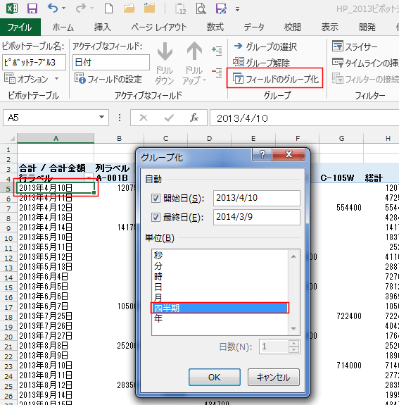 よねさんのExcelとWordの使い方|エクセル2013基本講座:目次|ピボットテーブルとピボットグラフ|ピボットテーブルで四半期を4月開始としたい