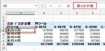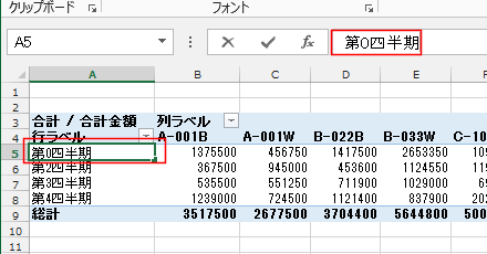 - 「第0四半期」を選択して、数式バーで「第4四半期」と書き換えます。