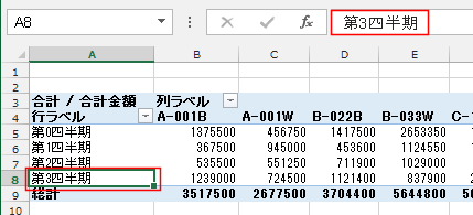 「第4四半期」を選択して、数式バーで「第3四半期」と書き換えます。