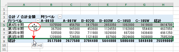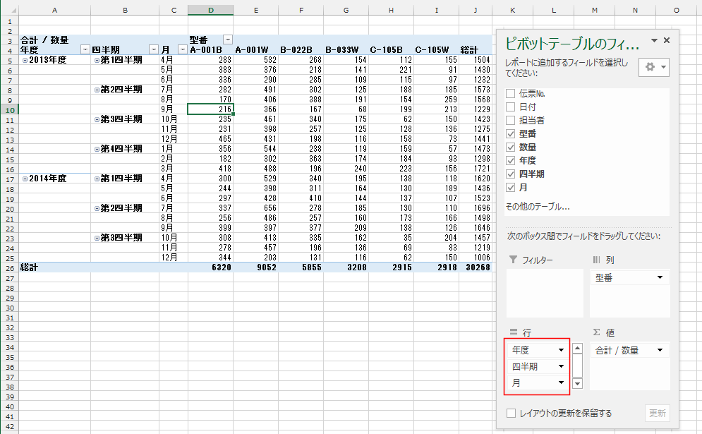 - 行に「年度」「四半期」「月」を配置しました。