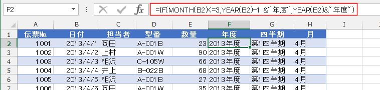 - 年度は =IF(MONTH(B2)<=3,YEAR(B2)-1 &"年度",YEAR(B2)&"年度") で求めました。