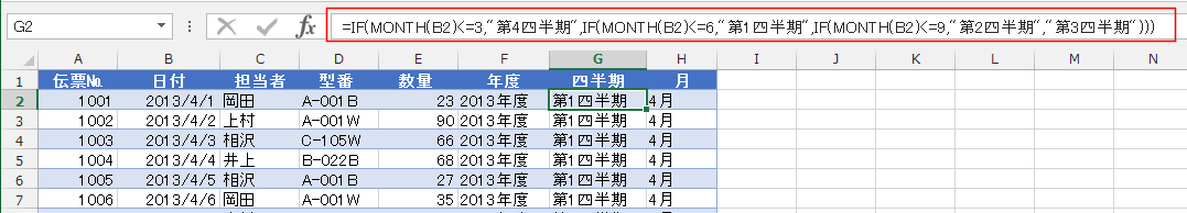 - 四半期は =IF(MONTH(B2)<=3,"第4四半期",IF(MONTH(B2)<=6,"第1四半期",IF(MONTH(B2)<=9,"第2四半期","第3四半期"))) で求めました。