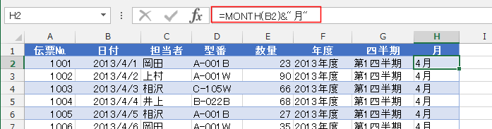 - 月は =MONTH(B2)&"月" で求めることができます。