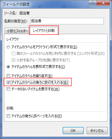 - [レイアウトと印刷]タブを選択して、「アイテムのラベルの後ろに空行を入れる」にチェックを入れます。