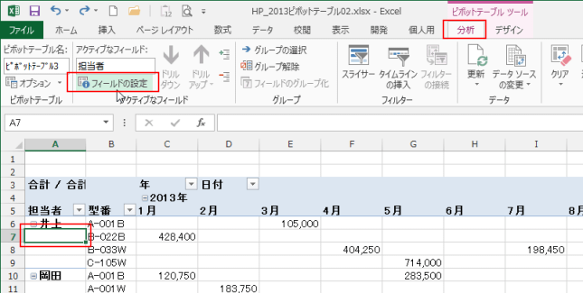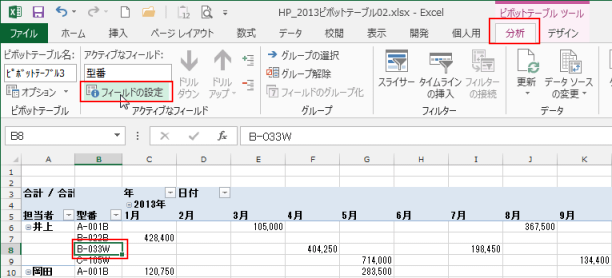 - ピボットテーブル ツールの[分析]タブを選択します。