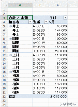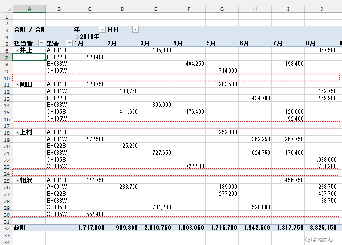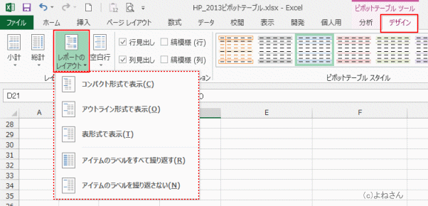 よねさんのExcelとWordの使い方|エクセル2013基本講座:目次|ピボットテーブルとピボットグラフ|ピボットテーブルのレポートのレイアウト