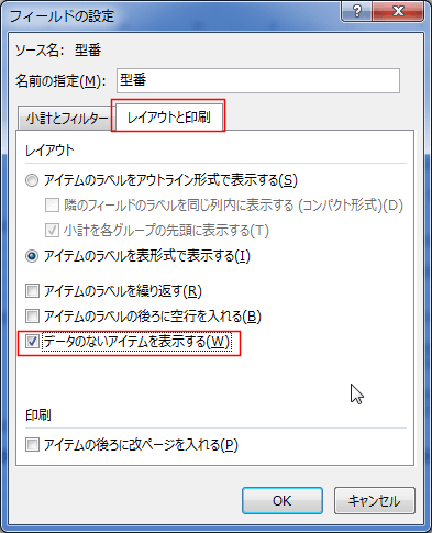 - [レイアウトと印刷]タブを選択して、「データのないアイテムを表示する」にチェックを入れます。