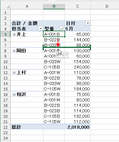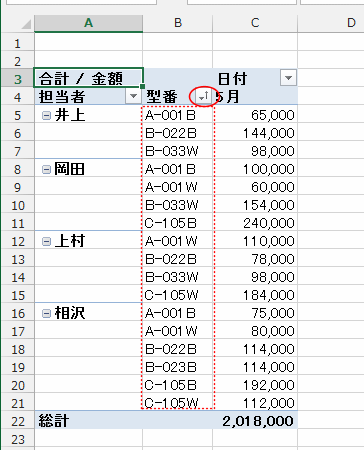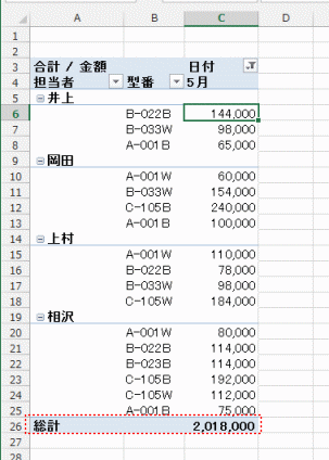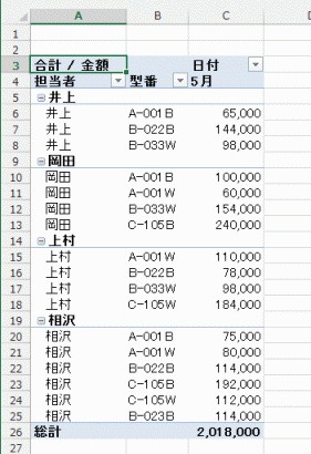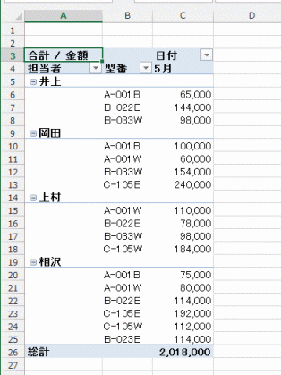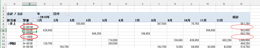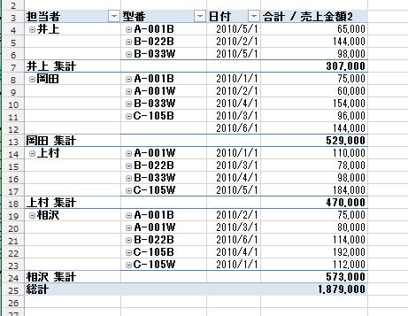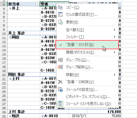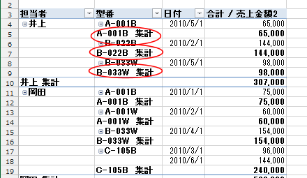 - 下図のような例ではフィールド「型番」に集計行(小計)が表示されています。