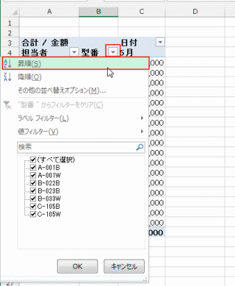 - フィールド名の[▼]ボタンをクリックして、[昇順]を選択しました。