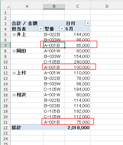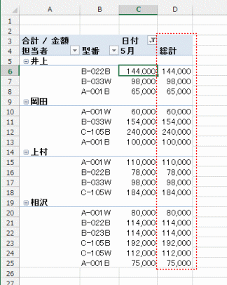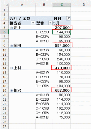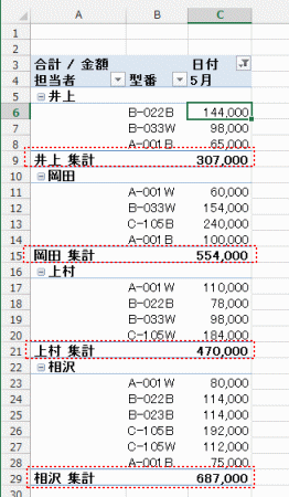 - すべての小計をグループの末尾に表示する(アウトライン形式で表示での例です)