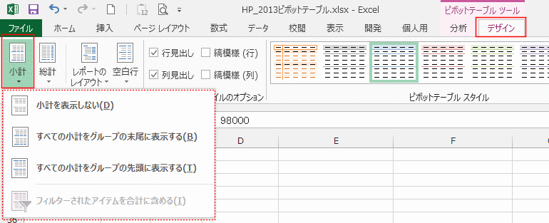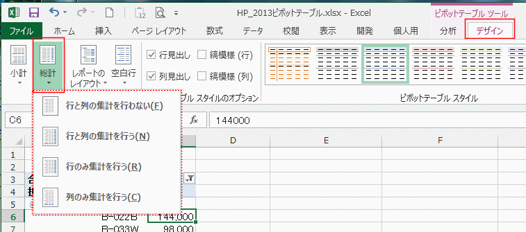 - ピボットテーブル ツールの[デザイン]タブを選択します。
