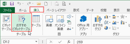 - [挿入]タブの[テーブル]グループに[おすすめピボットテーブル]というボタンがあります。