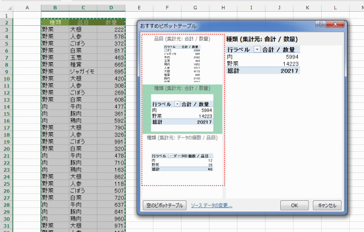 左側に3種類のピボットテーブルのサンプルが表示されました。