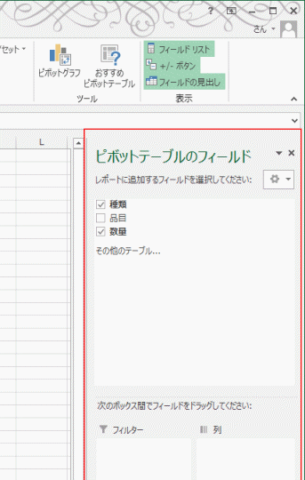- ウィンドウの右側には「ピボットテーブルの作業ウィンドウ」が表示されました。