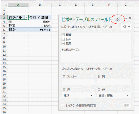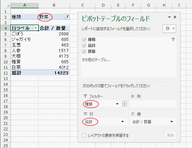 - フィルターに[種類]フィールドを追加し、行に[品目]フィールドを追加した例です。