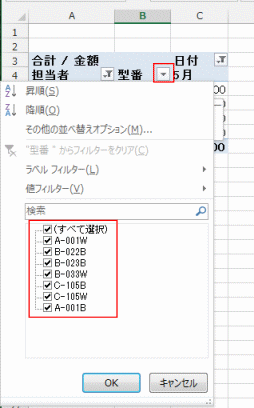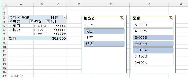 - 担当者で「岡田」と「相沢」、型番で「B-022B」「B-023B」「B-033W」を選択した状態です。