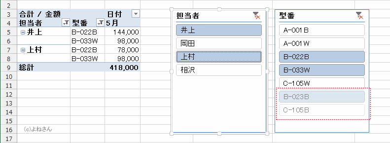 - ピボットテーブルに無いフィールドでもスライサーでフィルターが可能
