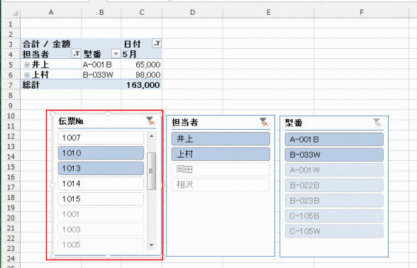ピボットテーブルには「伝票No」というフィールドは表示していませんが、スライサーで「伝票No」を使ってフィルターしている例です。