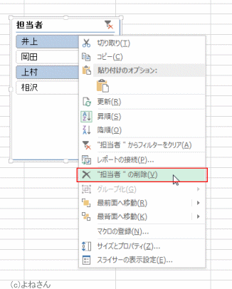 - 不要になったスライサーは選択して[Delete]キーを押すと削除されます。