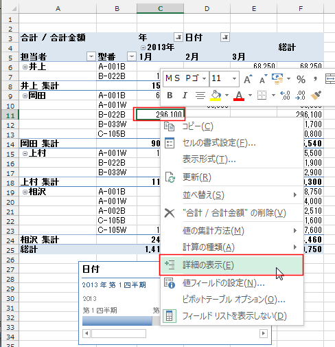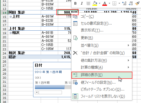 - ピボットテーブル の「岡田」の小計が表示されているセルを右クリックします。