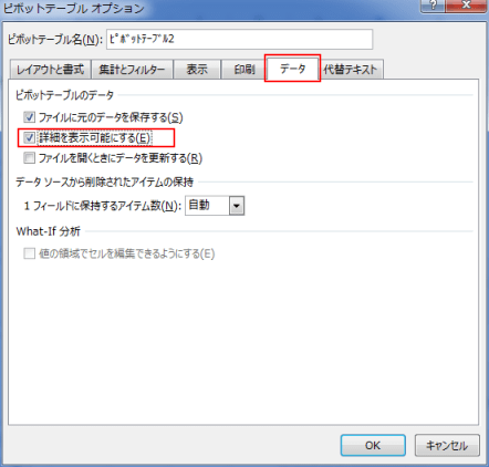 - [データ]タブで「詳細を表示可能にする」にチェックを入れます。