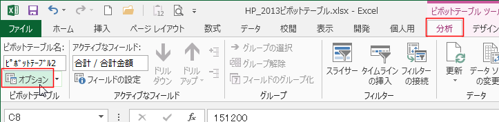 - ピボットテーブル ツールの[分析]タブを選択します。