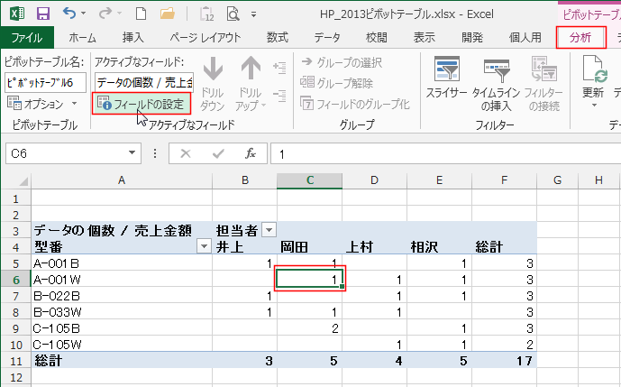 - ピボットテーブル ツールの[分析]タブを選択します。