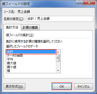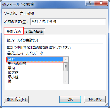 - 集計方法を選択します。下図では「合計」を選択しています。