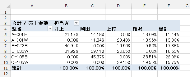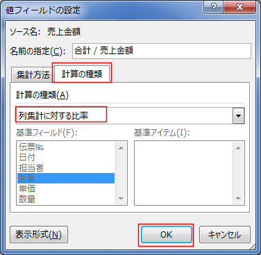 - 「計算の種類」を選択して、「列集計に対する比率」を選択します。