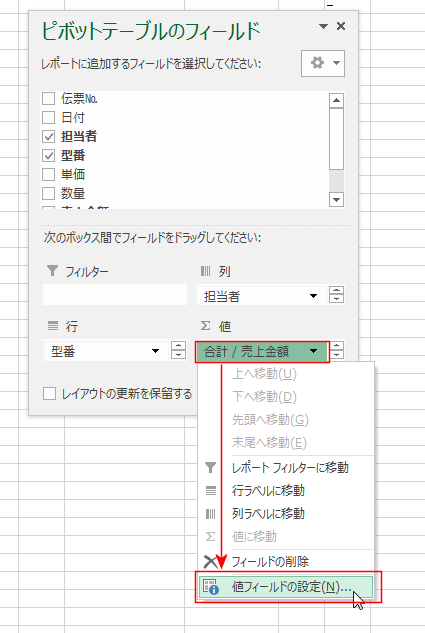 - ピボットテーブルのフィールドで値のボックスに配置したフィールドをクリックします。