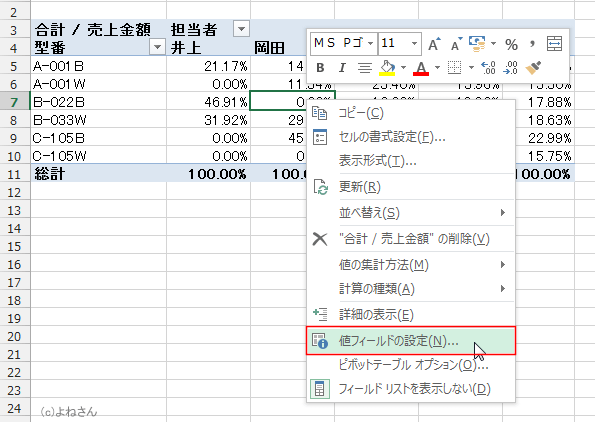 - 値の表示されているセルを右クリックして、「値フィールドの設定」をクリックします。