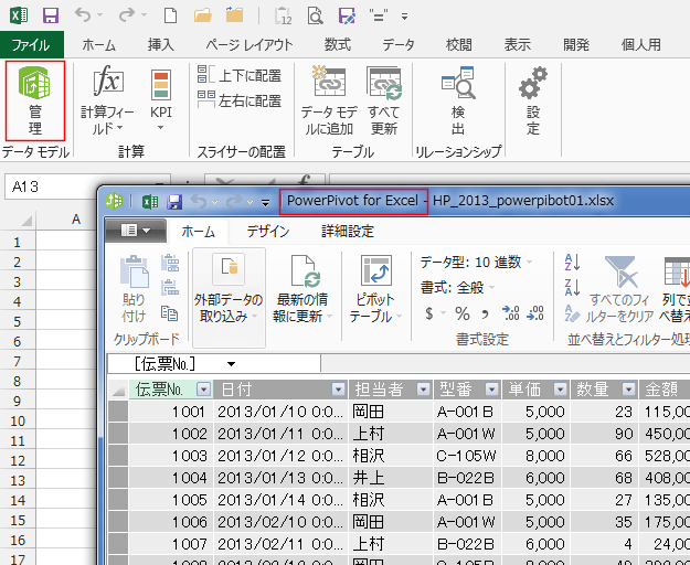 PowerPivotタブをクリックして、[管理]をクリックして、PowerPivot for Excelを開きます。