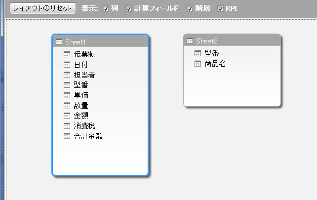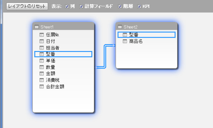 下図のように両方の[型番]がリレーションシップで結ばれたのが分かります。