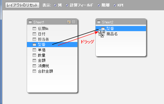 Sheet1の[型番」とSheet2の[型番」とでリレーションシップを作成したいので、Sheet1の[型番」をSheet2の[型番」までドラッグします。