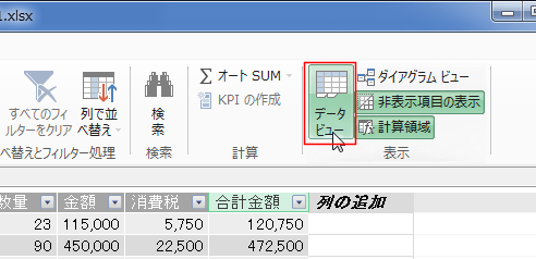 「データビュー]をクリックすると、ダイアグラムビューが消えて、データビューが表示されます。