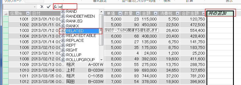 数式バーに =r と入力して、 RELATEDを選択して[Tab]キーを押します。もしくは、RELATEDをダブルクリックします。