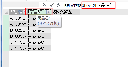 =RELATED(Sheet2「商品名」 と入力されます。 後ろに ) を入力して、[Enter]キーで数式を確定します。