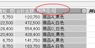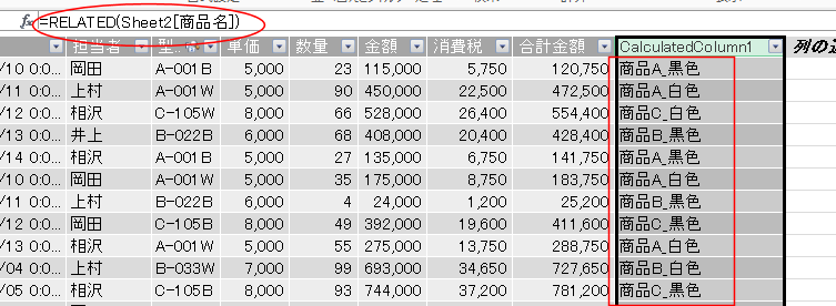 列見出しが 「CalculatedColumn1」となっていますので、「CalculatedColumn1」部分をダブルクリックして、「商品名」と入力しました。