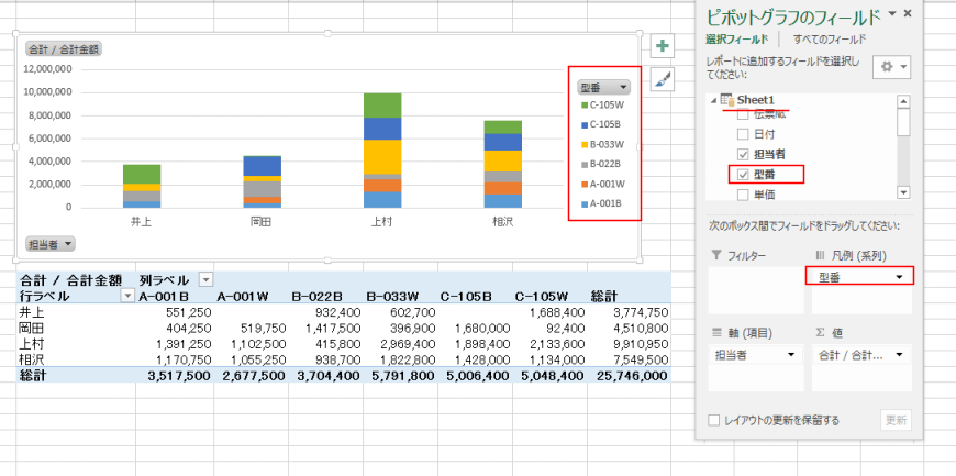 ピボットグラフの凡例にはSheet1の「型番」が配置してあります。