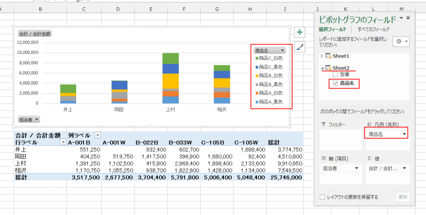 凡例にSheet2の「商品名」を設定して、リレーションシップが働いているのを確認してみます。
