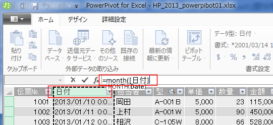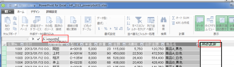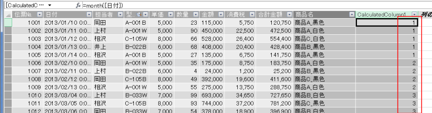 この後、列見出しが 「CalculatedColumn1」となっていますので、「CalculatedColumn1」部分をダブルクリックして、「月」と入力しています。