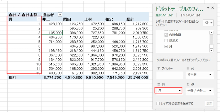 ピボットテーブルに作成した計算列「月」を使用してみます。