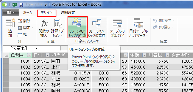 - PowerPivot for Excelの[デザイン]タブの[リレーションシップの作成]を実行します。