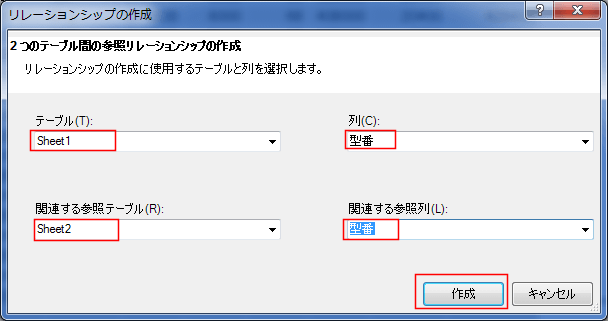 ここでは、Sheet1の「型番」とSheet2の「型番」とを指定します。