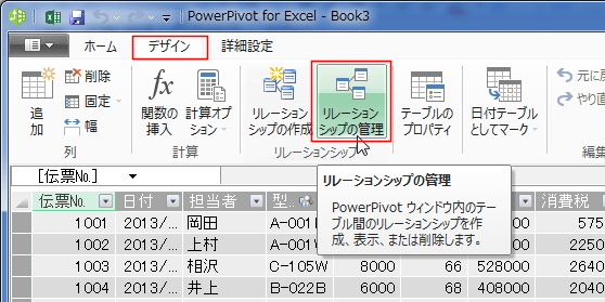 - PowerPivot for Excelの[デザイン]タブの[リレーションシップの管理]を実行します。