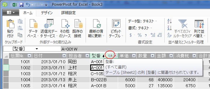 データビューの列見出し「型番」をポイントすると、リレーションシップが設定されていることがポップアップで表示されます。