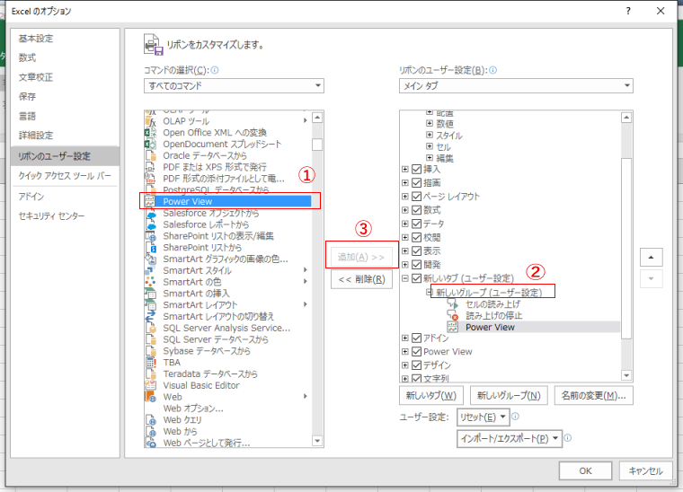 - Excel2016ではPowerViewのコマンドボタンがありませんのでリボンなどへ追加しておくと便利です。