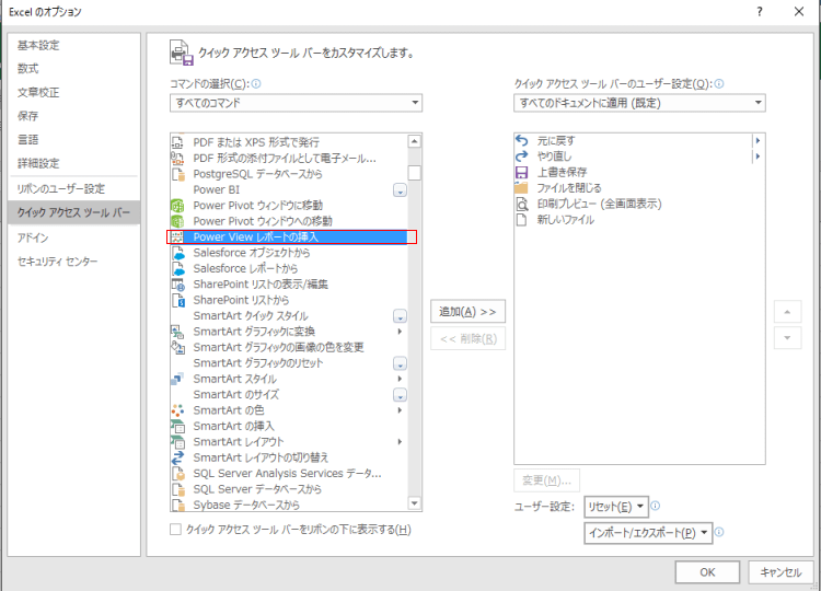 - なお、クイックアクセスツールバーへの登録の際には「PowerViewレポートの挿入」という名称になっています。