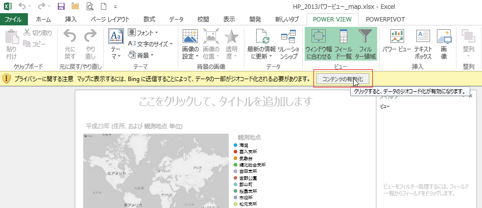 - PowerViewを使ったExcelファイルをExcel2013で開きました。