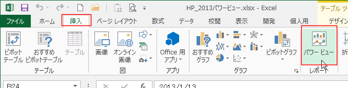 - [挿入]タブの[レポート]グループにある[パワービュー]を実行します。